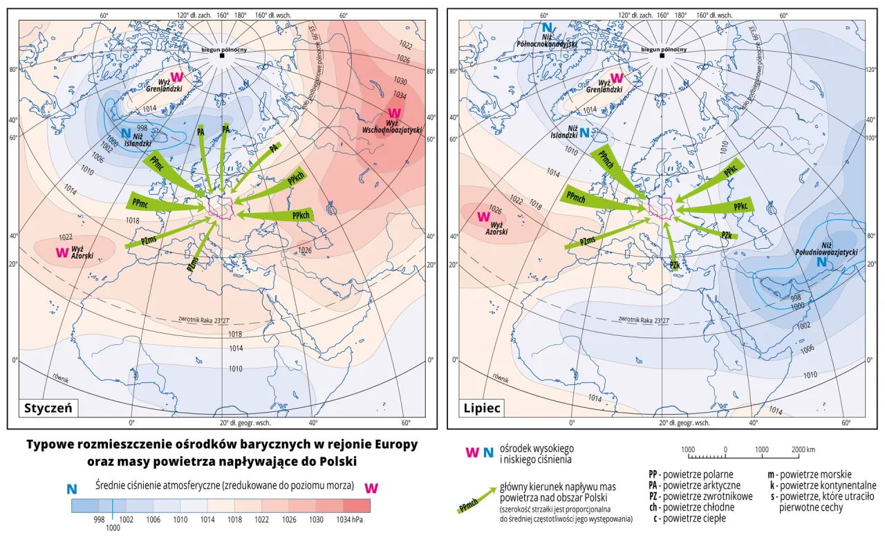 - Przemieszczanie się mas powietrza morskiego i kontynentalnego wpływa na zmienność pogody.